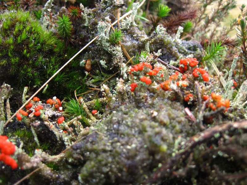 Lush close-up of red fungi and moss on forest floor, showcasing the diversity of woodland ecosystems with vibrant green mosses and colorful fungi, perfect for outdoor enthusiasts and nature lovers.