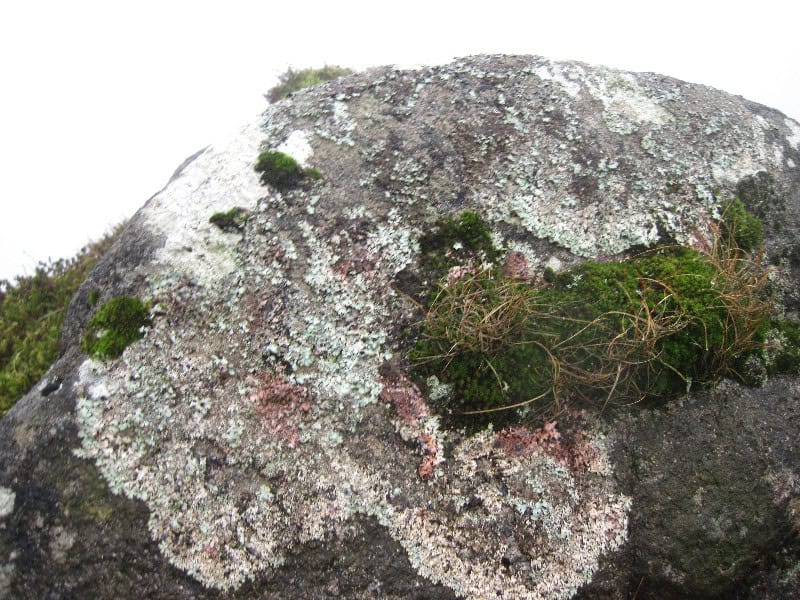 A detailed close-up of a large rock surface adorned with various types of lichen, moss, and tiny plants, illustrating the beauty of natural wilderness and outdoor adventures for hikers and nature enthusiasts.