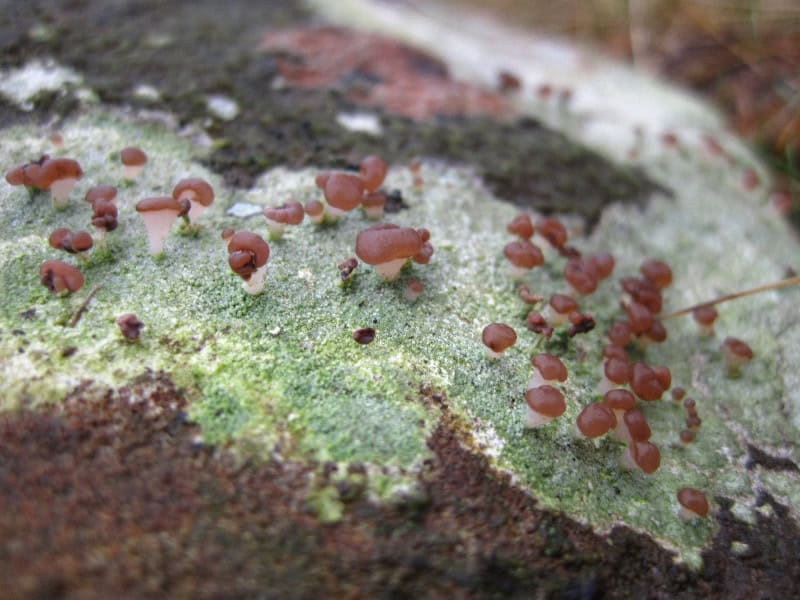 A close-up of small brown mushrooms emerging from moss on tree bark, highlighting fungi found in natural forest environments.