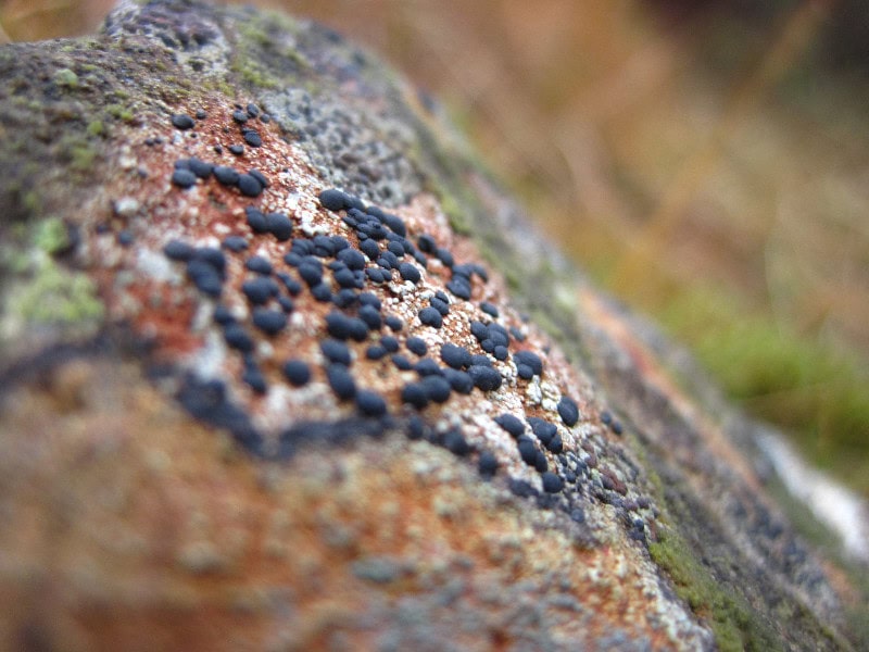 A detailed close-up of black and white fungi growing on the bark of a tree in a forest, showcasing raw nature and biodiversity. Perfect for outdoor enthusiasts, hikers, and nature explorers interested in fungi and forest ecosystems.