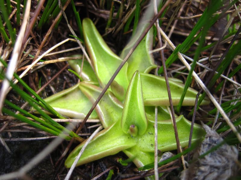 A detailed photo of a star-shaped succulent plant thriving in a grassy, outdoor setting, highlighting unique plant morphology and natural environment.