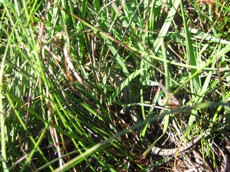 A close-up of a small snake blending into tall green grass in a natural outdoor environment, emphasizing wildlife and nature exploration for hiking and outdoor enthusiasts.