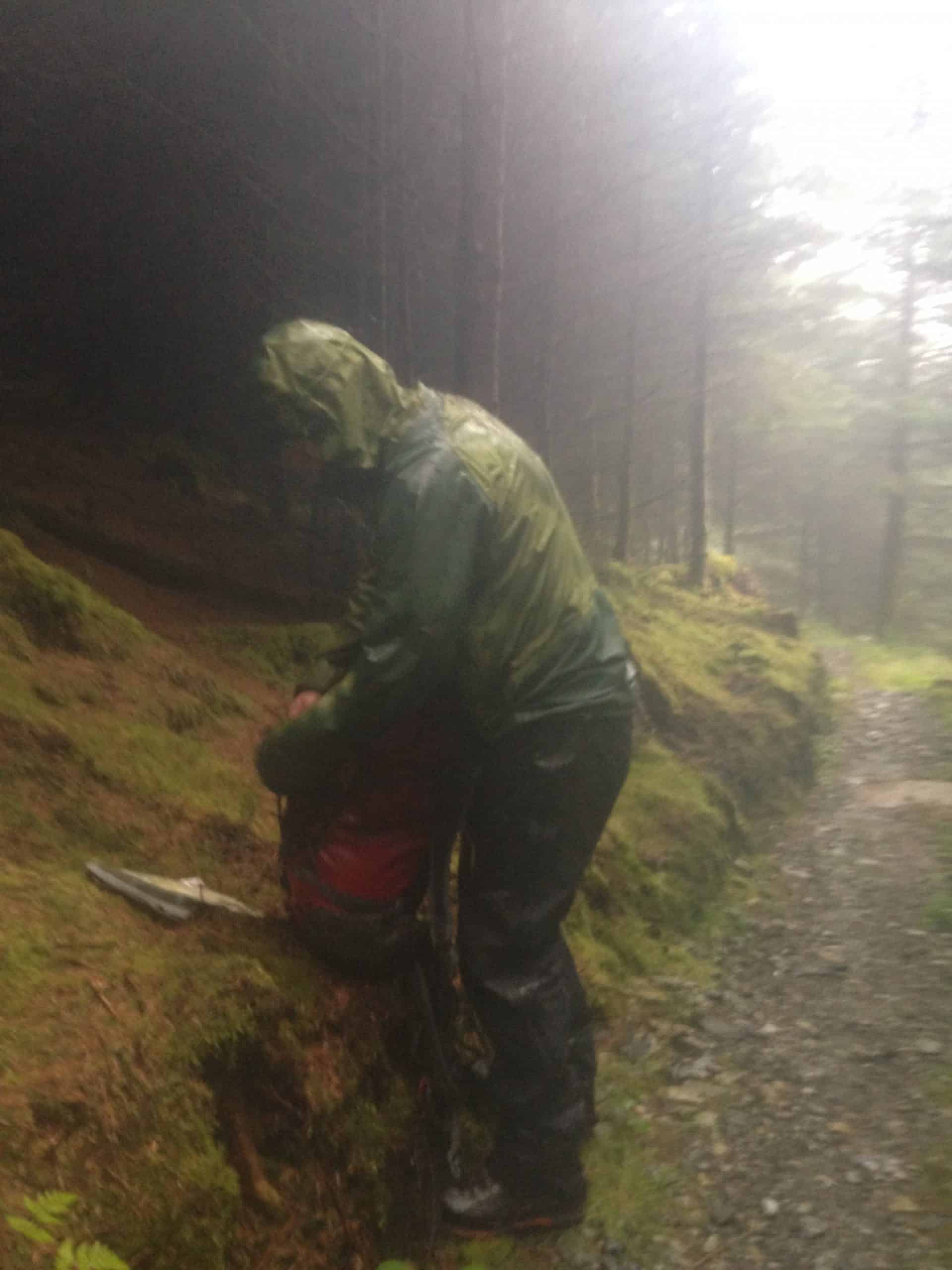A hiker wearing waterproof clothing crouches on a mossy forest trail during misty rain.