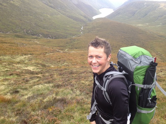 A smiling female hiker with a large green and grey backpack exploring a scenic mountain trail. The lush valley and distant snow-capped peaks provide a stunning backdrop, perfect for outdoor enthusiasts interested in hiking and adventure travel.