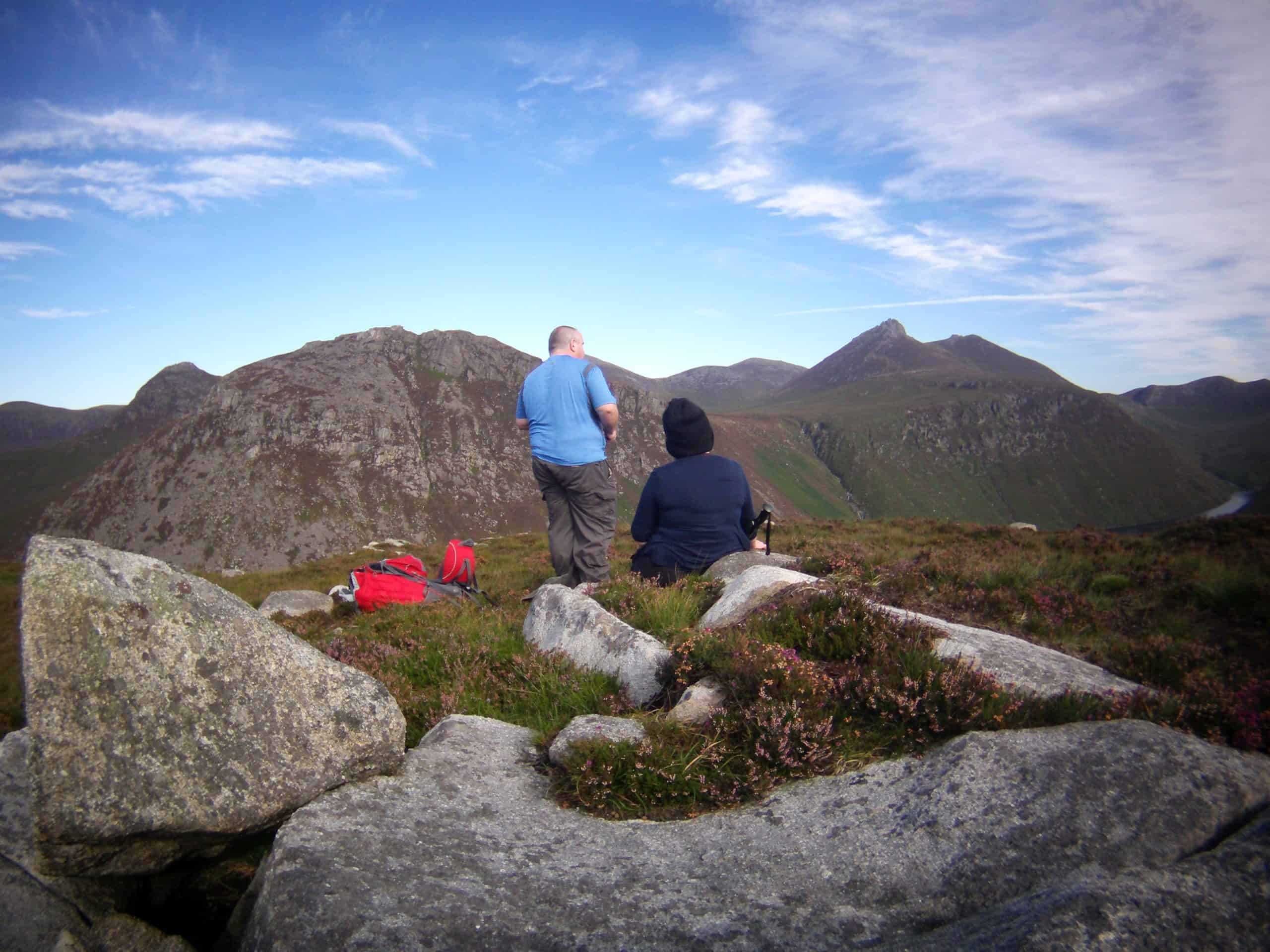 A scenic outdoor scene featuring two hikers resting on rocky terrain amidst lush greenery and stunning mountain views, showcasing the beauty of UK hiking trails and wilderness adventures. The image highlights outdoor activity, hiking gear, and the tranquility of nature.