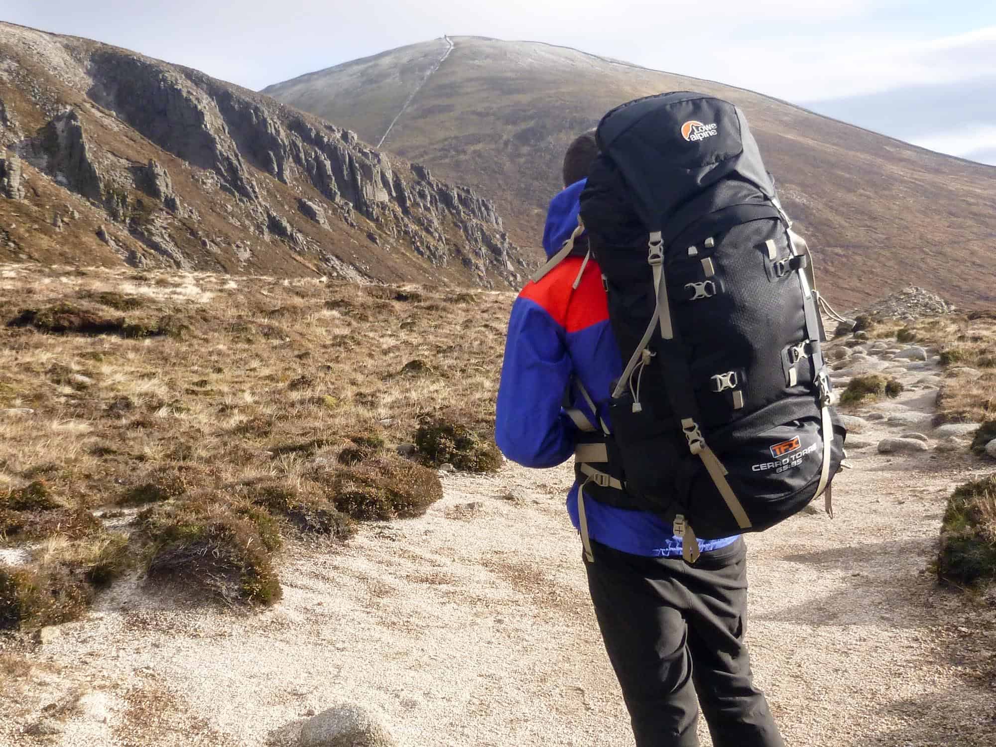 A hiker dressed in outdoor gear with a large backpack explores a rugged mountain trail, surrounded by rocky terrain and rolling hills, ideal for hiking and outdoor activity websites.
