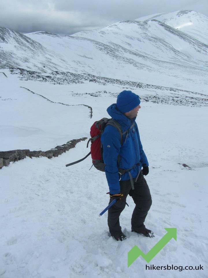 Snow-covered mountain landscape with a hiker dressed in blue, equipped with backpack and hiking poles.