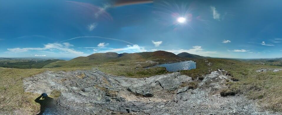 A panoramic view of rolling green hills, a clear mountain lake, and a blue sky with a few clouds, ideal for outdoor hiking and nature adventures.