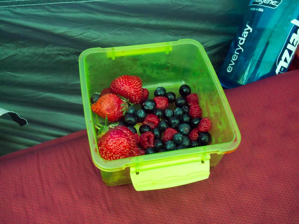 A bright green plastic container filled with freshly picked strawberries, blueberries, and raspberries, ideal for outdoor hiking trips and healthy snacking on the go.