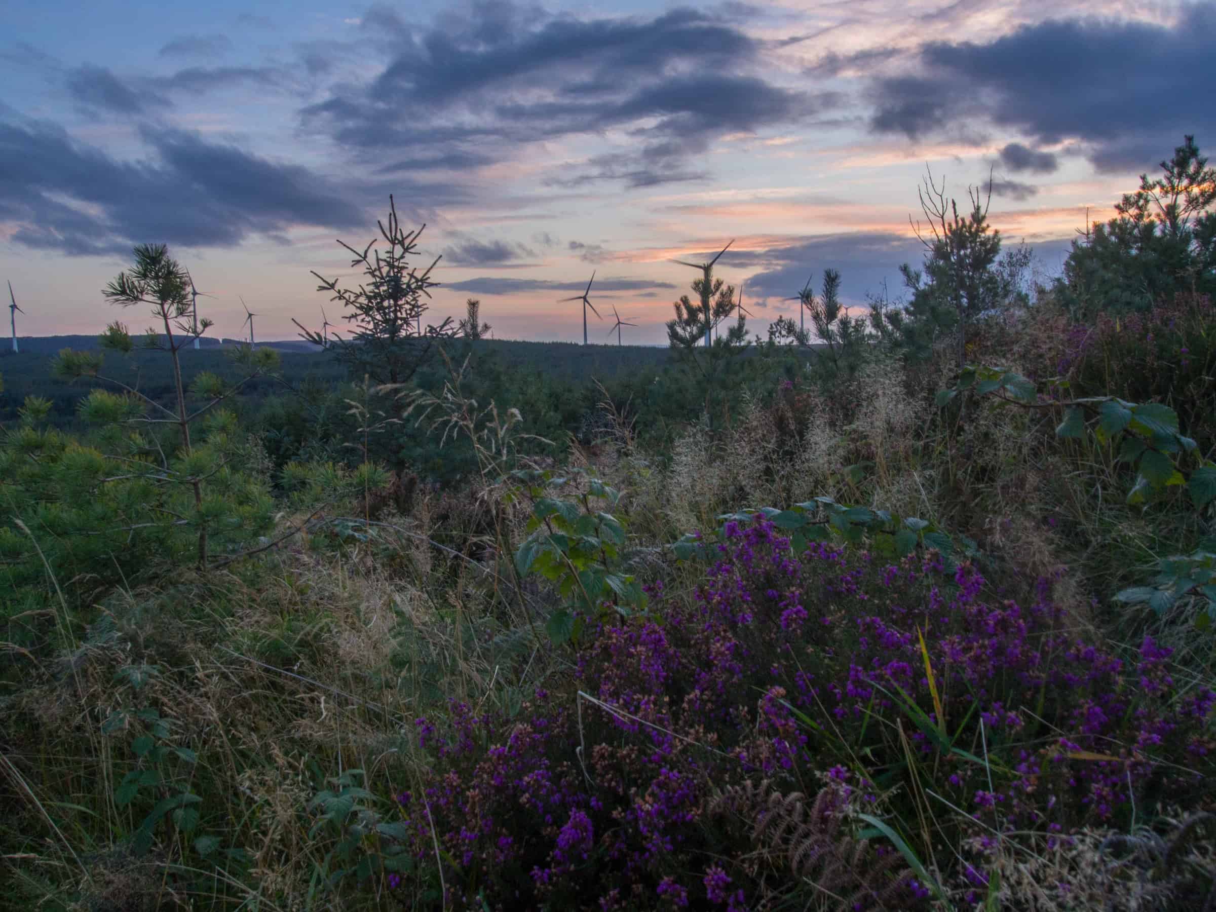 A scenic landscape captured during sunset featuring purple heather and diverse wild plants in the foreground, with wind turbines on distant hills under a partly cloudy sky, highlighting outdoor adventures, nature exploration, and renewable energy.