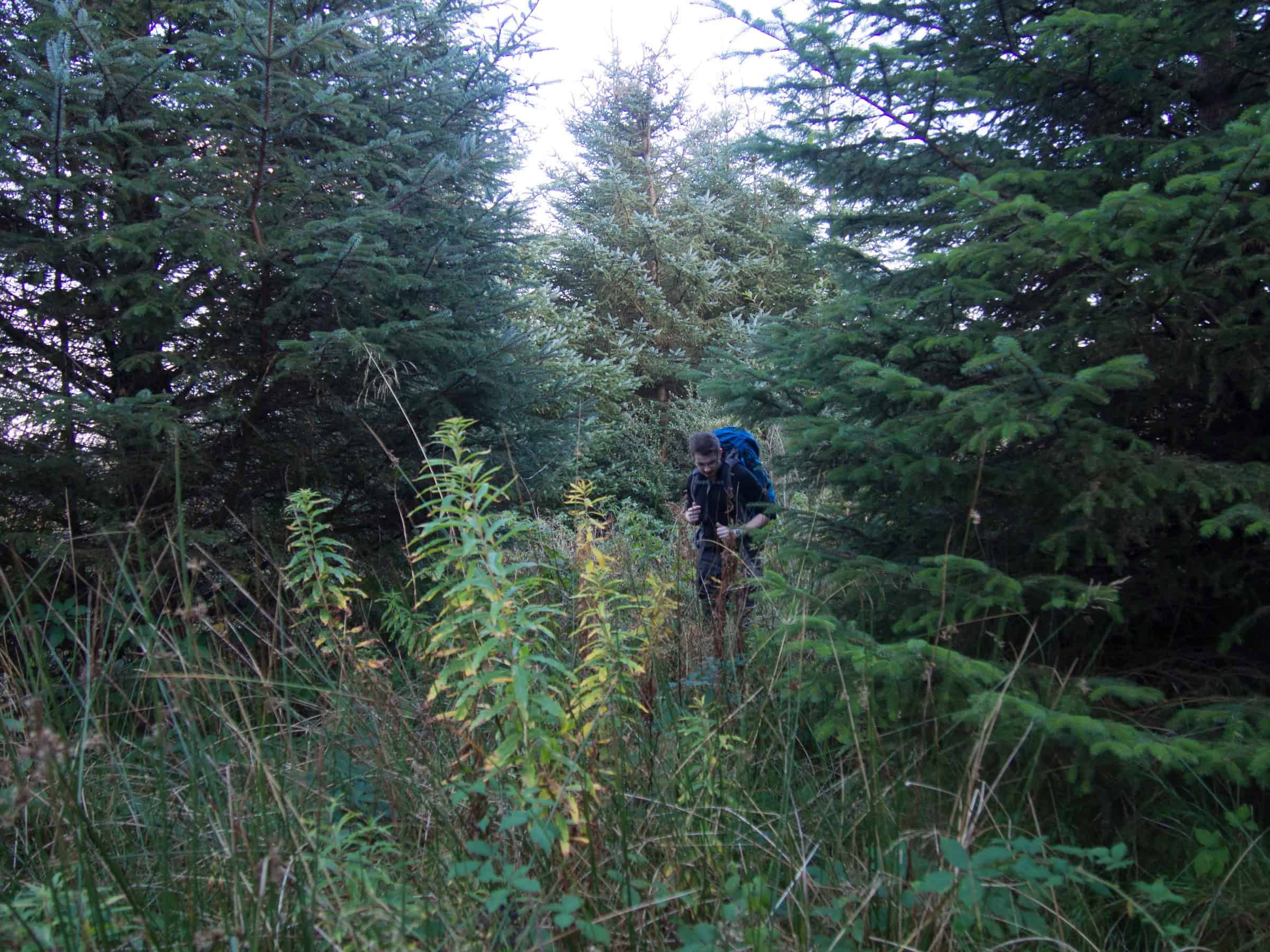 A hiker with a backpack walking through a dense, lush forest trail surrounded by tall pine trees and vibrant foliage.