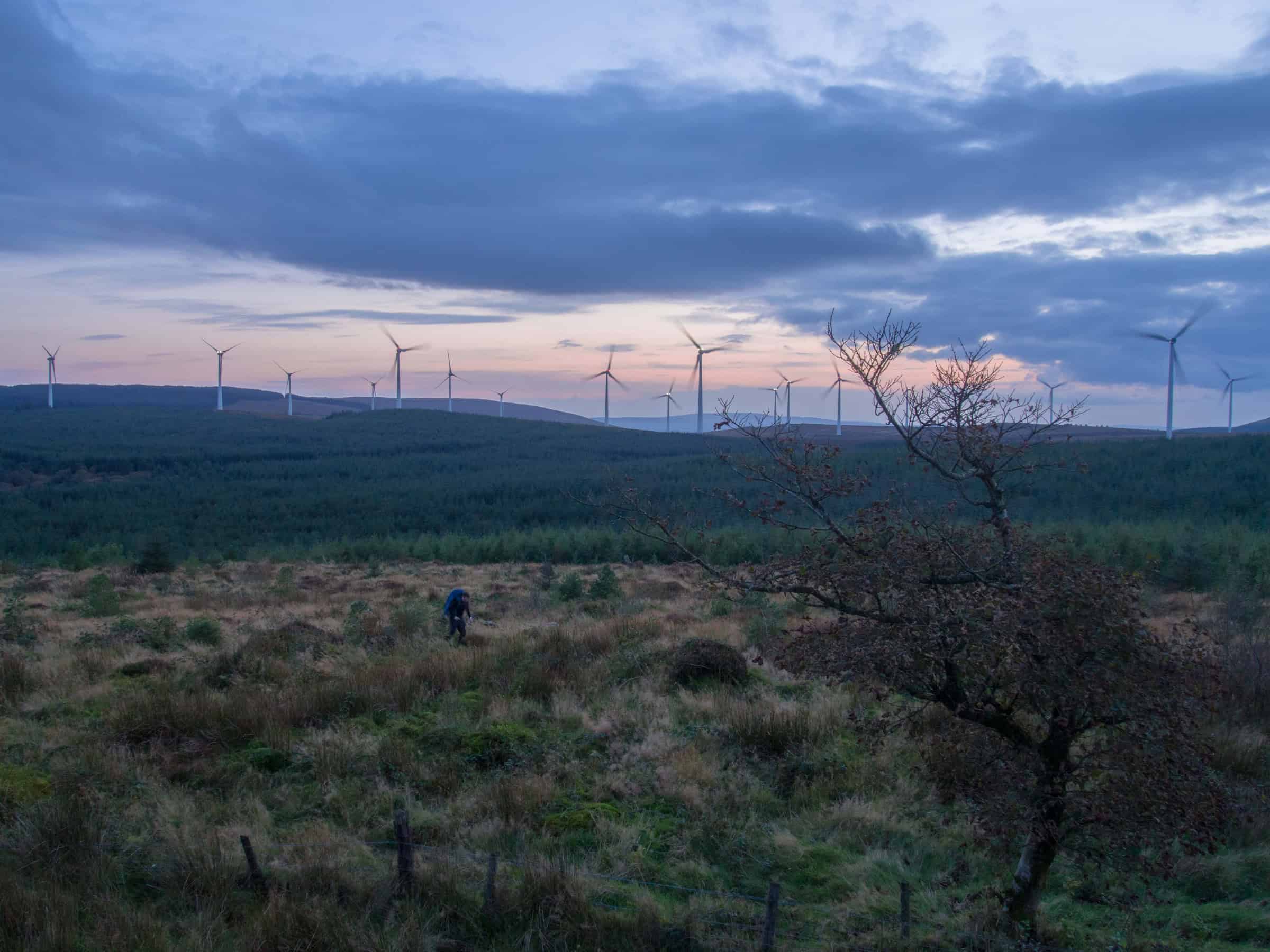 A hiker exploring a natural landscape with wind turbines in the background during sunset, showcasing eco-friendly energy, outdoor trekking adventures, and scenic vistas perfect for wildlife and nature lovers.