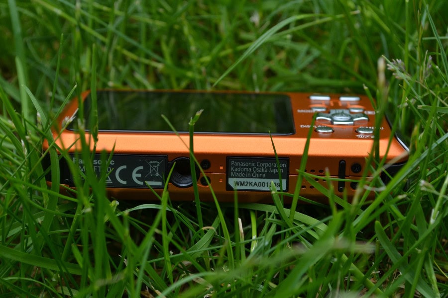 A close-up shot of an orange handheld voice recorder placed on green grass during a hike, showcasing portable audio equipment suitable for outdoor recording and adventure documentation.