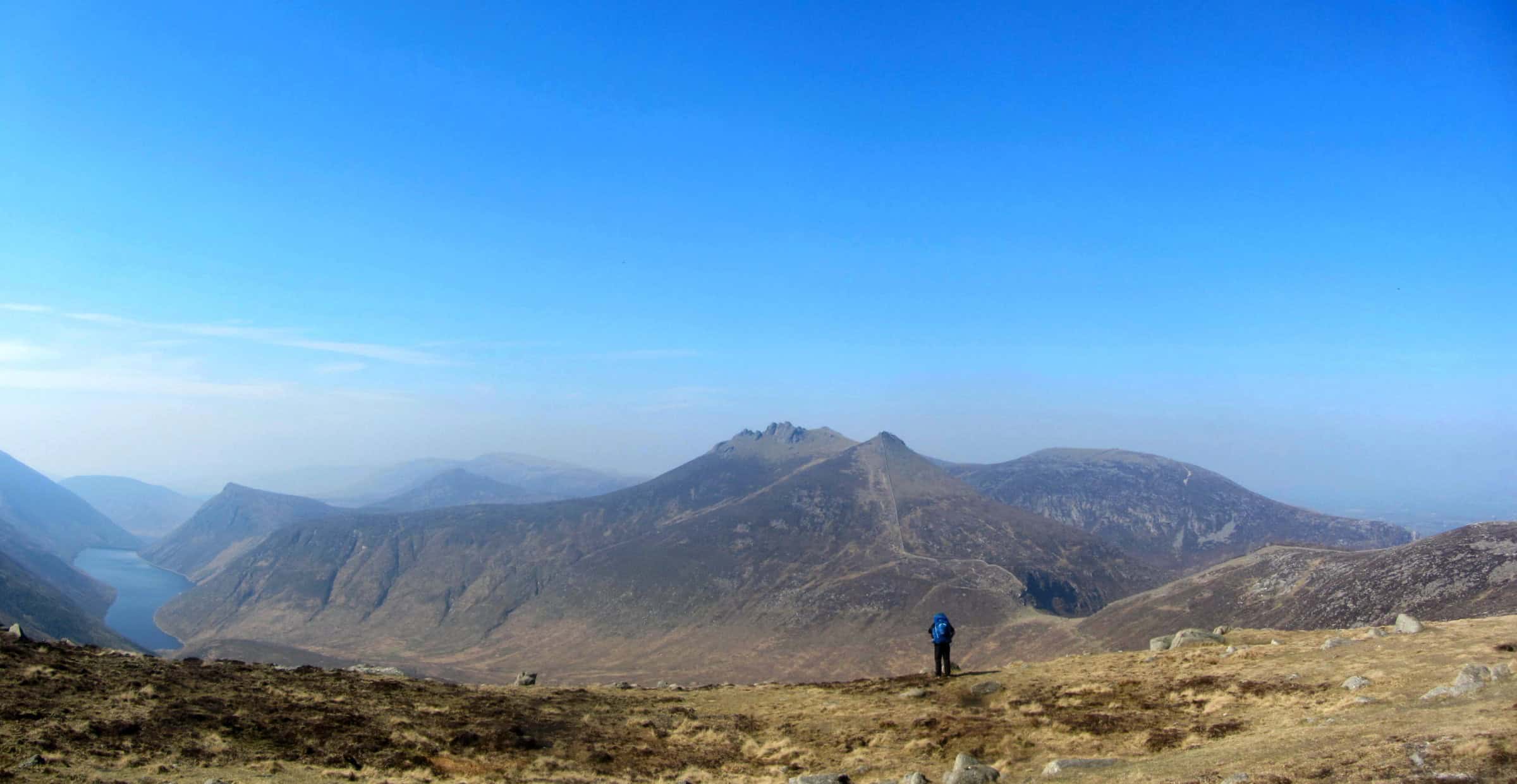 Hiker standing in a vast mountain landscape with clear blue sky, rugged hills, and a lake in the valley, showcasing outdoor adventure, trekking, and nature exploration. Ideal for hiking, backpacking, and outdoor travel enthusiasts looking for scenic trails and mountain escapades.