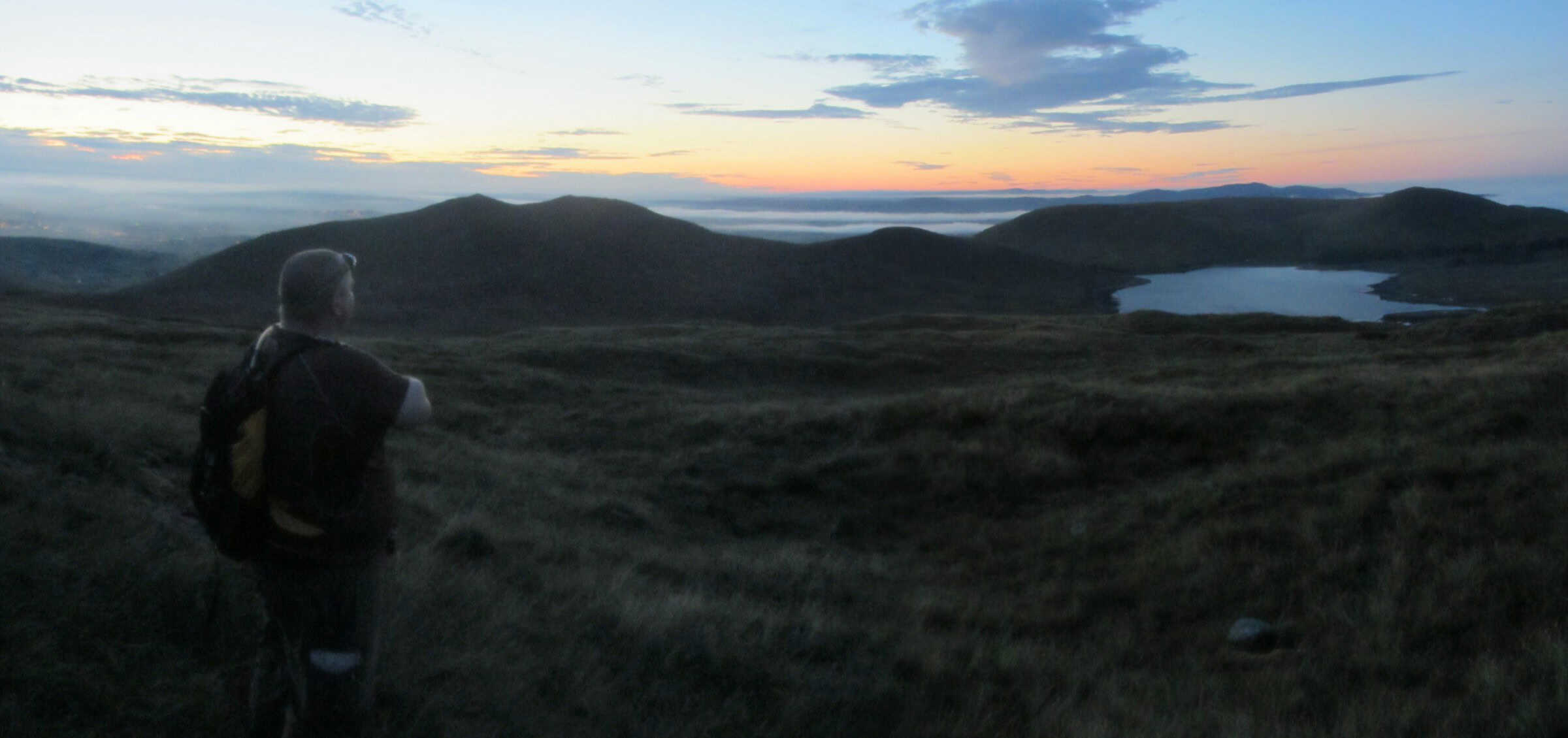 A hiker stands on a rugged trail overlooking a peaceful lake and rolling hills at dusk, capturing the essence of mountain hiking, nature exploration, and outdoor adventure in a scenic wilderness setting.