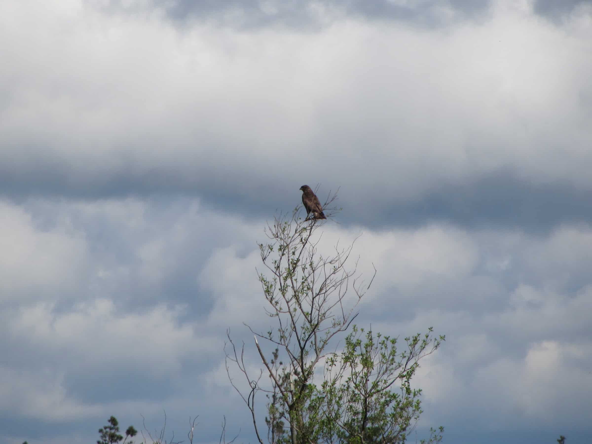 A solitary bird sitting on a tall, spindly tree with sparse foliage, under a moody sky filled with gray clouds, illustrating the beauty of outdoor exploration and wildlife spotting for hikers.