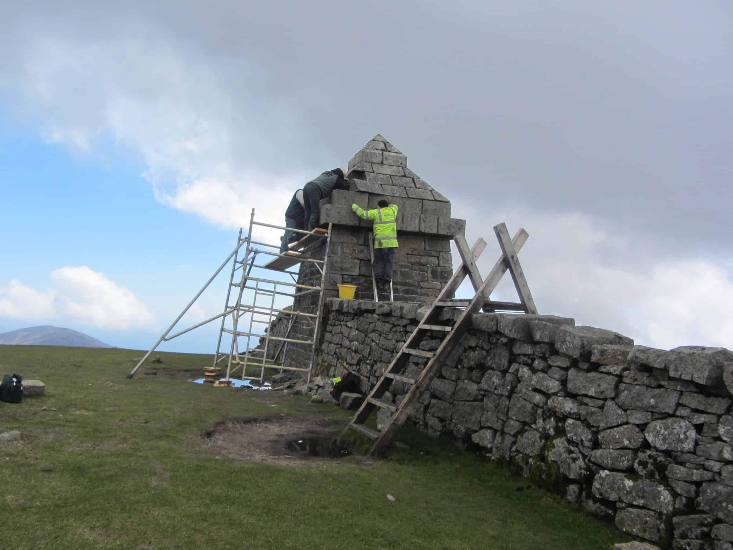 A team of workers in safety gear repair and restore an ancient stone monument or structure on a scenic hillside, utilizing scaffolding and ladders for access. This outdoor activity emphasizes heritage conservation, outdoor preservation work, and the importance of maintaining historical landmarks in natural environments. The cloudy sky and distant landscape add to the picturesque, outdoor setting.