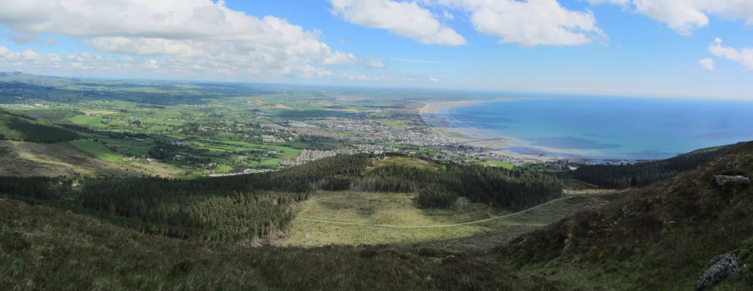 Scenic view from a mountain overlooking the vibrant green coastline, with lush forests, rolling hills, and the vast blue sea, perfect for hikers exploring the UK’s best outdoor trails and nature walks.