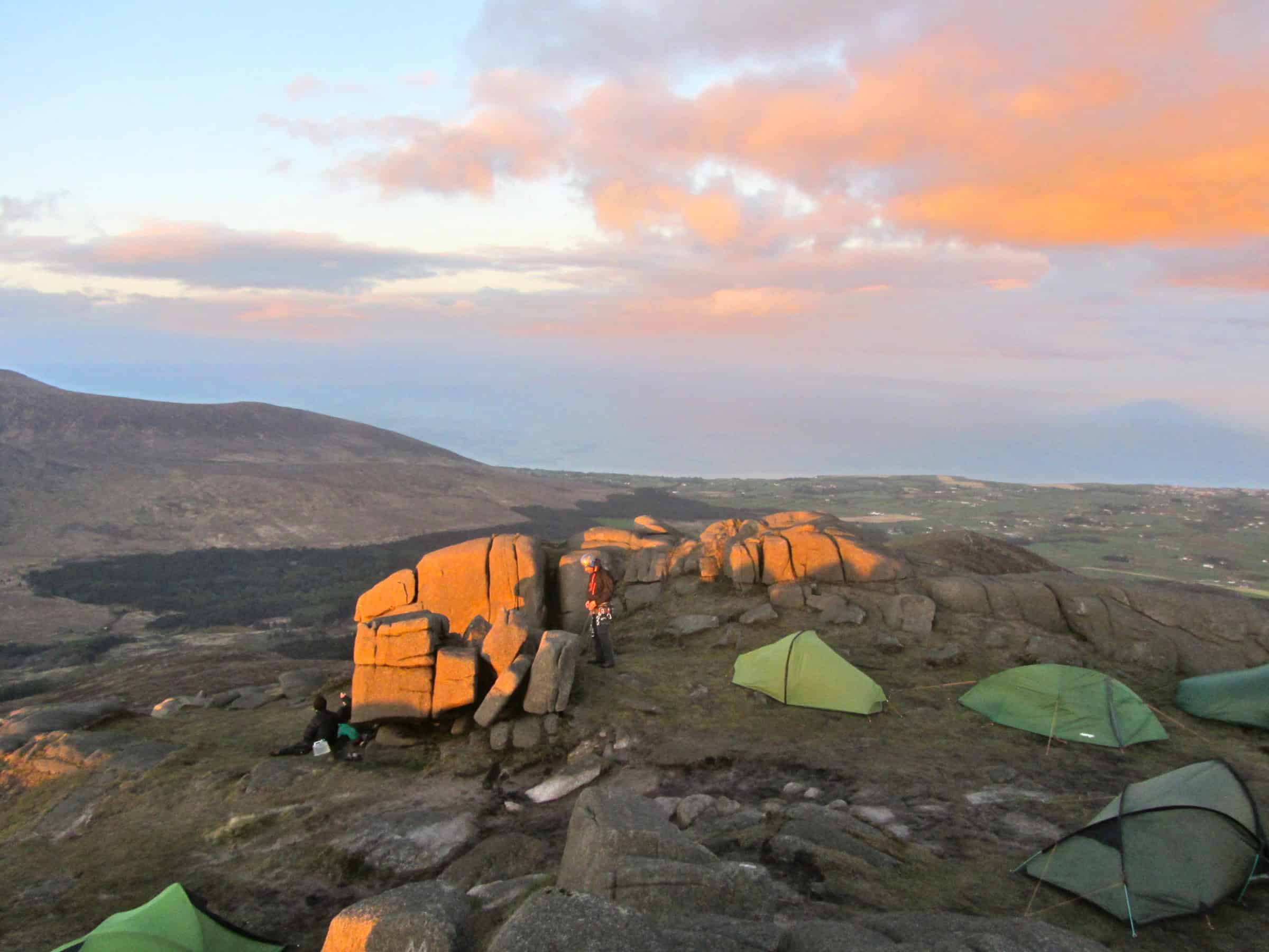 A picturesque sunset over a mountain landscape with tent camping setup on a rocky terrain, featuring multiple tents and hikers enjoying the outdoor experience amid stunning natural scenery.