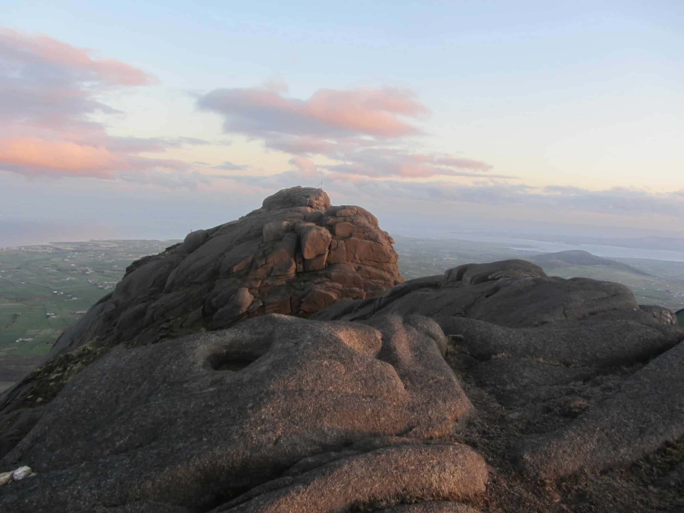 Stunning landscape of rugged mountain rocks with a panoramic view of the countryside and sky during early morning or late evening lighting.
