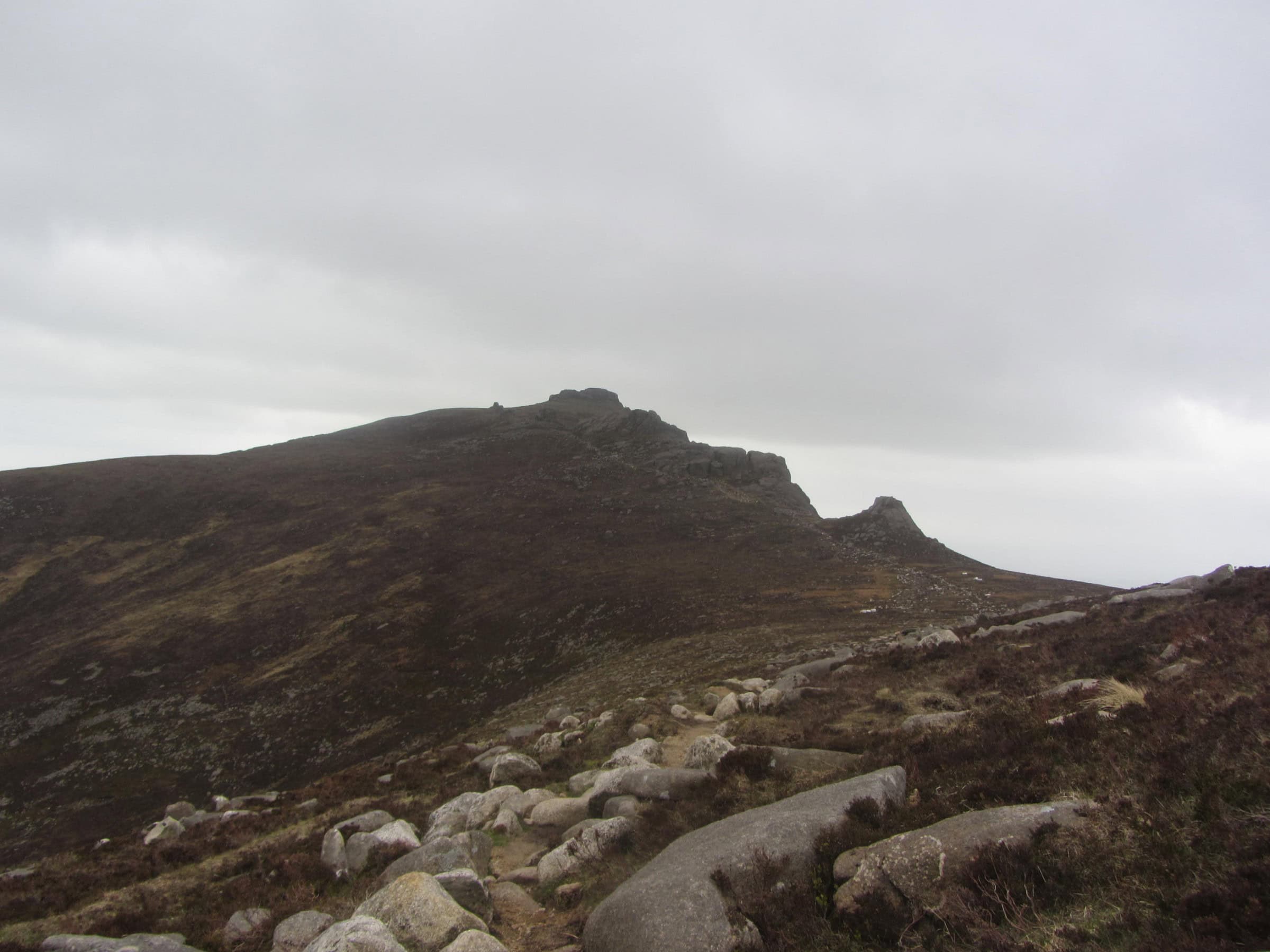 Stunning hiking trail through rocky terrain leading up to a mountain summit, perfect for adventure seekers and nature lovers.