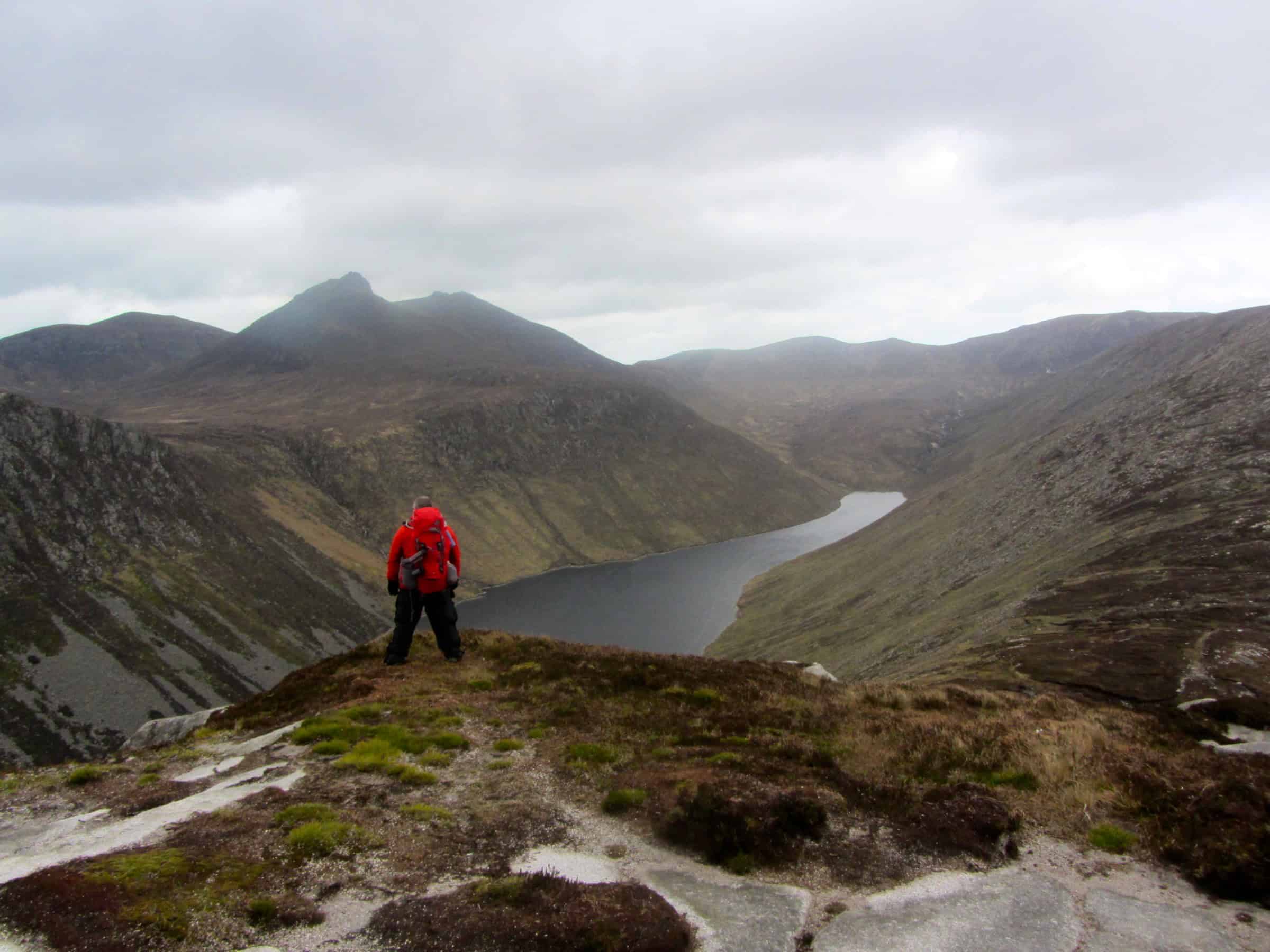 A hiker stands on a grassy ledge gazing at a serene mountain lake surrounded by moorland and hills, under an overcast sky, perfect for outdoor exploration and hiking enthusiasts seeking scenic wilderness experiences.