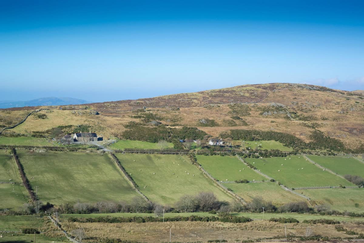 A scenic panoramic view of lush farmland, stone boundary walls, and gentle rolling hills with sparse houses, capturing the serene beauty of countryside hiking trails and outdoor exploration.