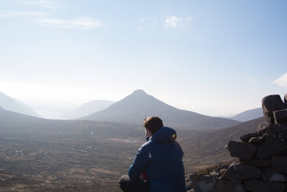 A hiker seated on a rocky outcrop gazes over a vast, remote mountain landscape with rolling hills, a prominent conical mountain in the background, and a clear sky, capturing the essence of outdoor exploration and adventure.