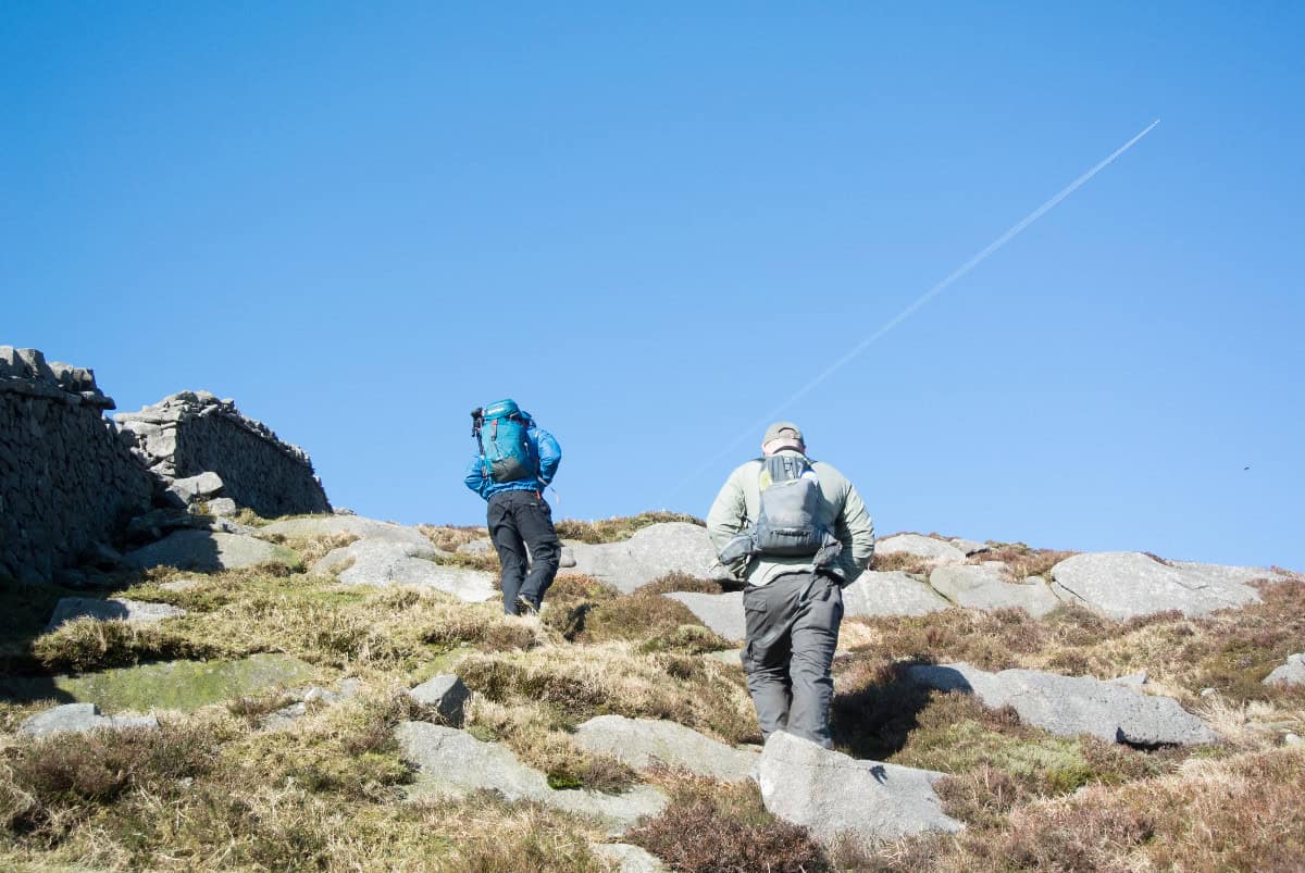 Two hikers ascending a rocky, grassy hillside with backpacks and outdoor gear, enjoying a mountain trekking adventure in scenic outdoor terrain.