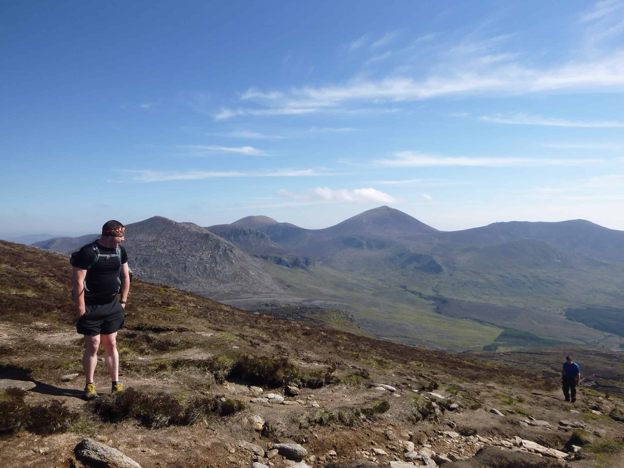 A hiker with a backpack walking along a mountain trail with a stunning view of rolling peaks and lush valleys, ideal for outdoor exploration and mountain trekking.