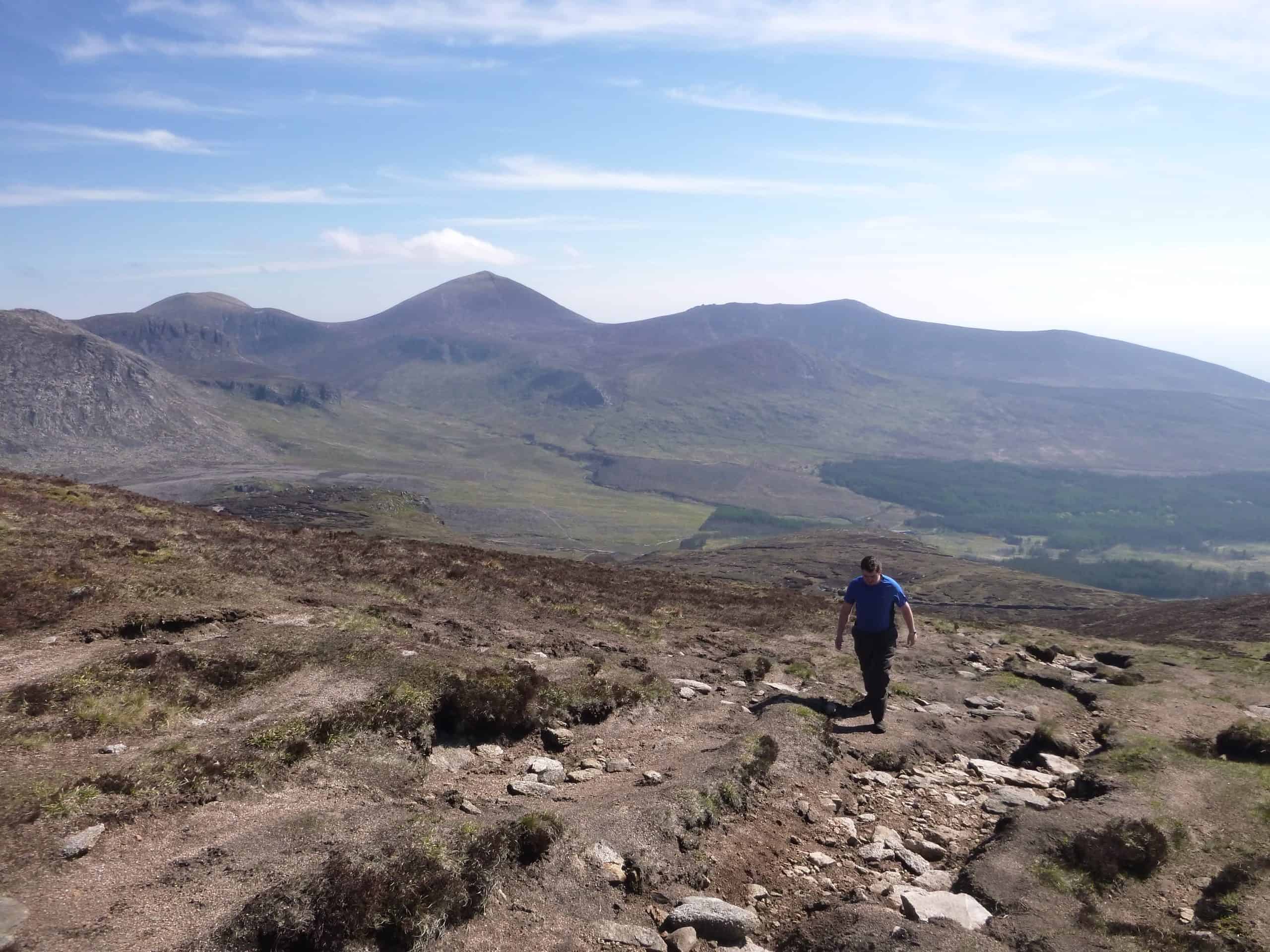 A hiker walking along a rocky trail with breathtaking mountain views in the background, showcasing outdoor adventure and hiking experiences.