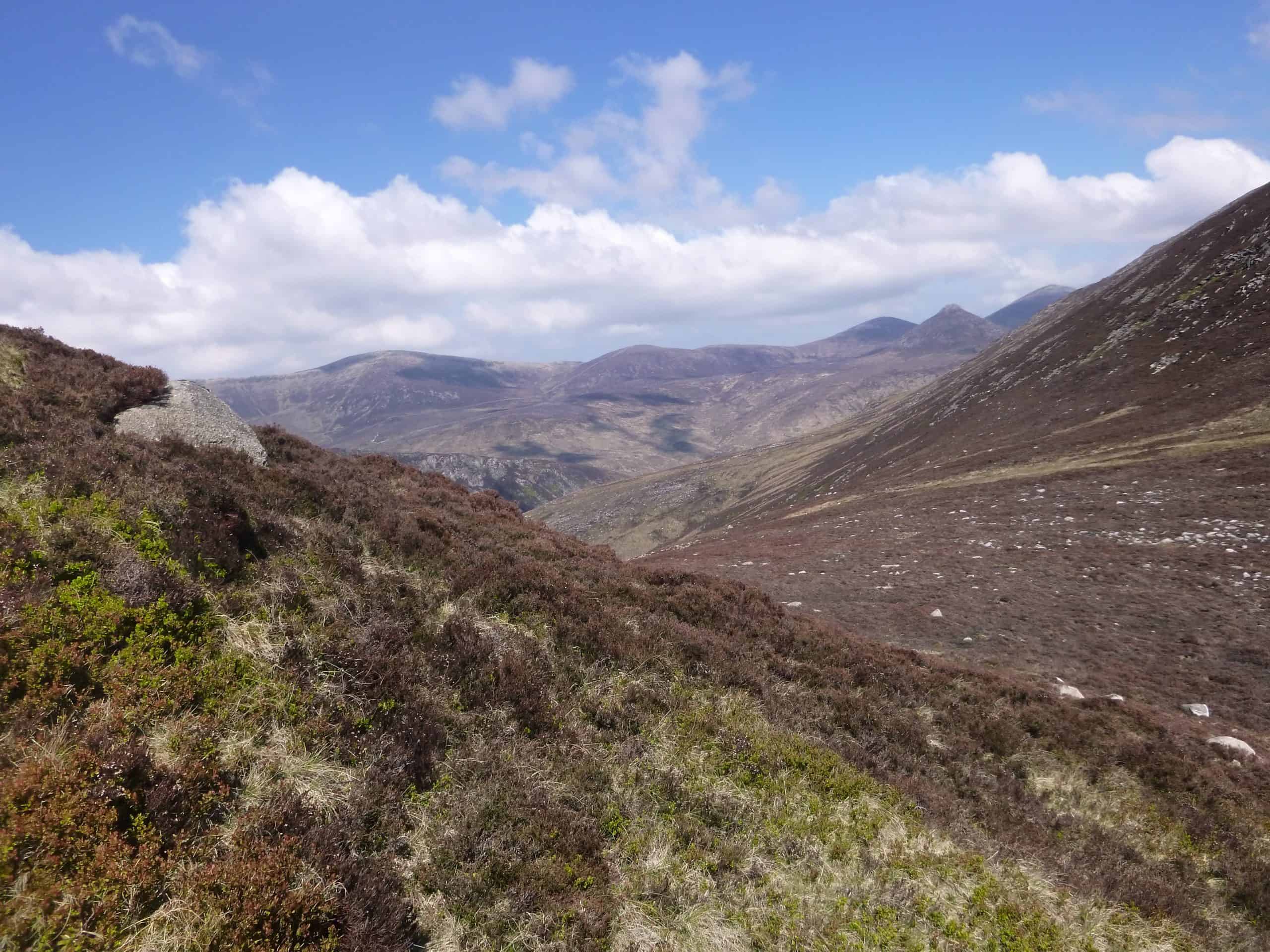 Hiking mountain landscape with rolling hills, rugged terrain, and bright blue sky, perfect for outdoor adventures, trekking, and exploring nature in the UK or similar hilly regions.