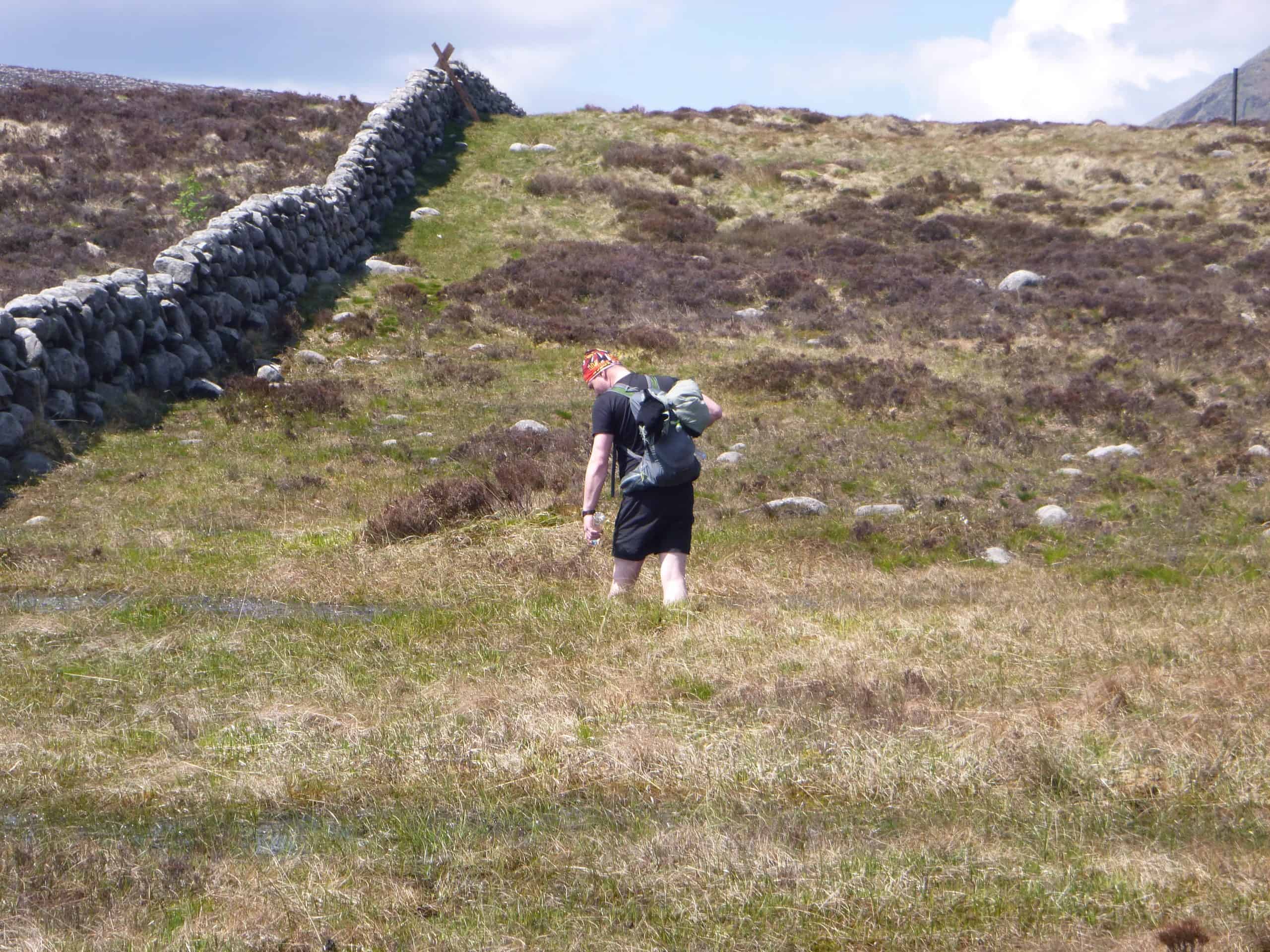 A hiker with a backpack exploring scenic landscape on a trail through grassy hills and stone walls, perfect for outdoor enthusiasts and adventure seekers.