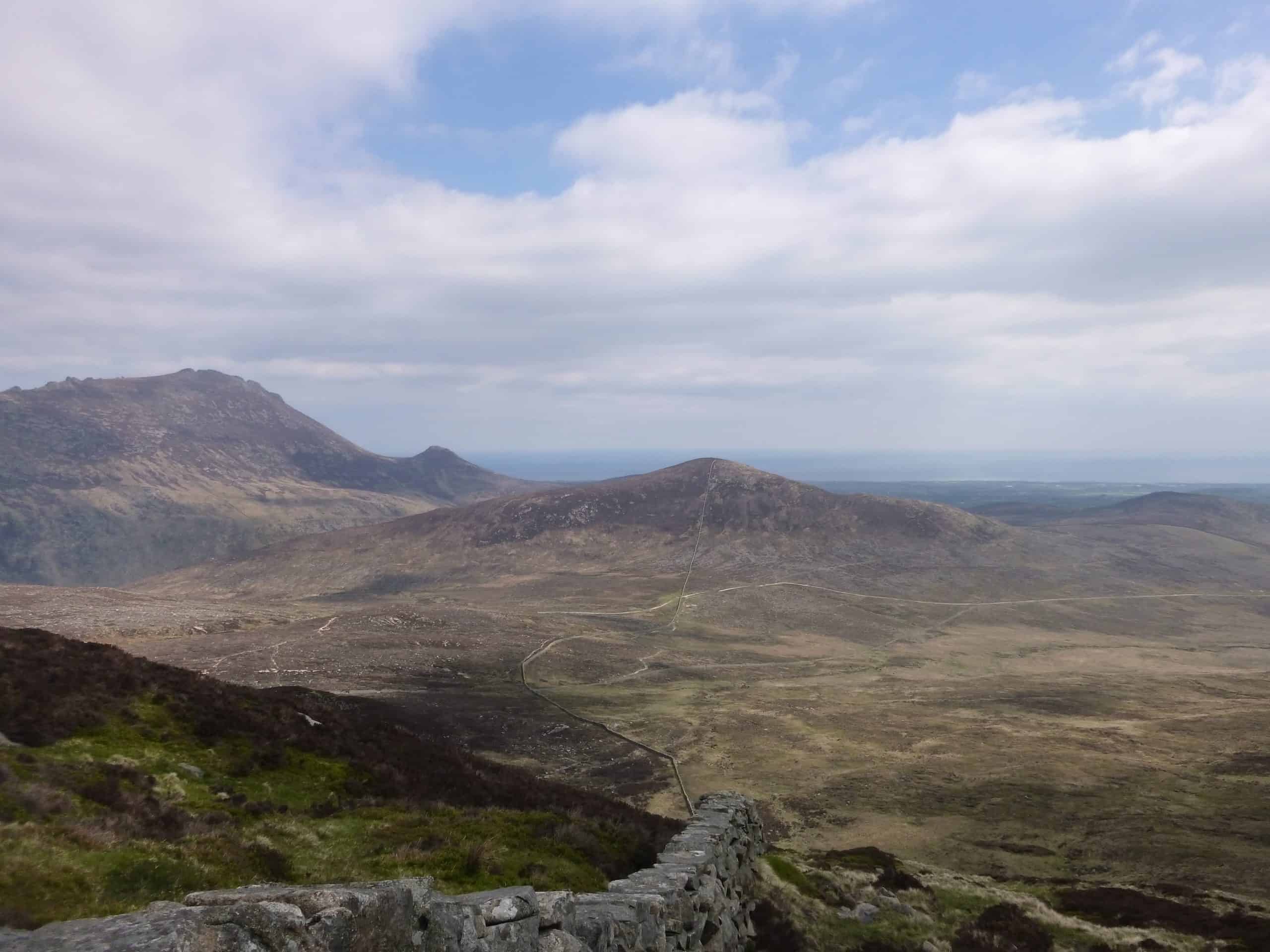 A panoramic view of the rugged mountain range showcases expansive moorlands, winding pathways, and distant peaks under a partly cloudy sky, perfect for hikers and outdoor lovers.