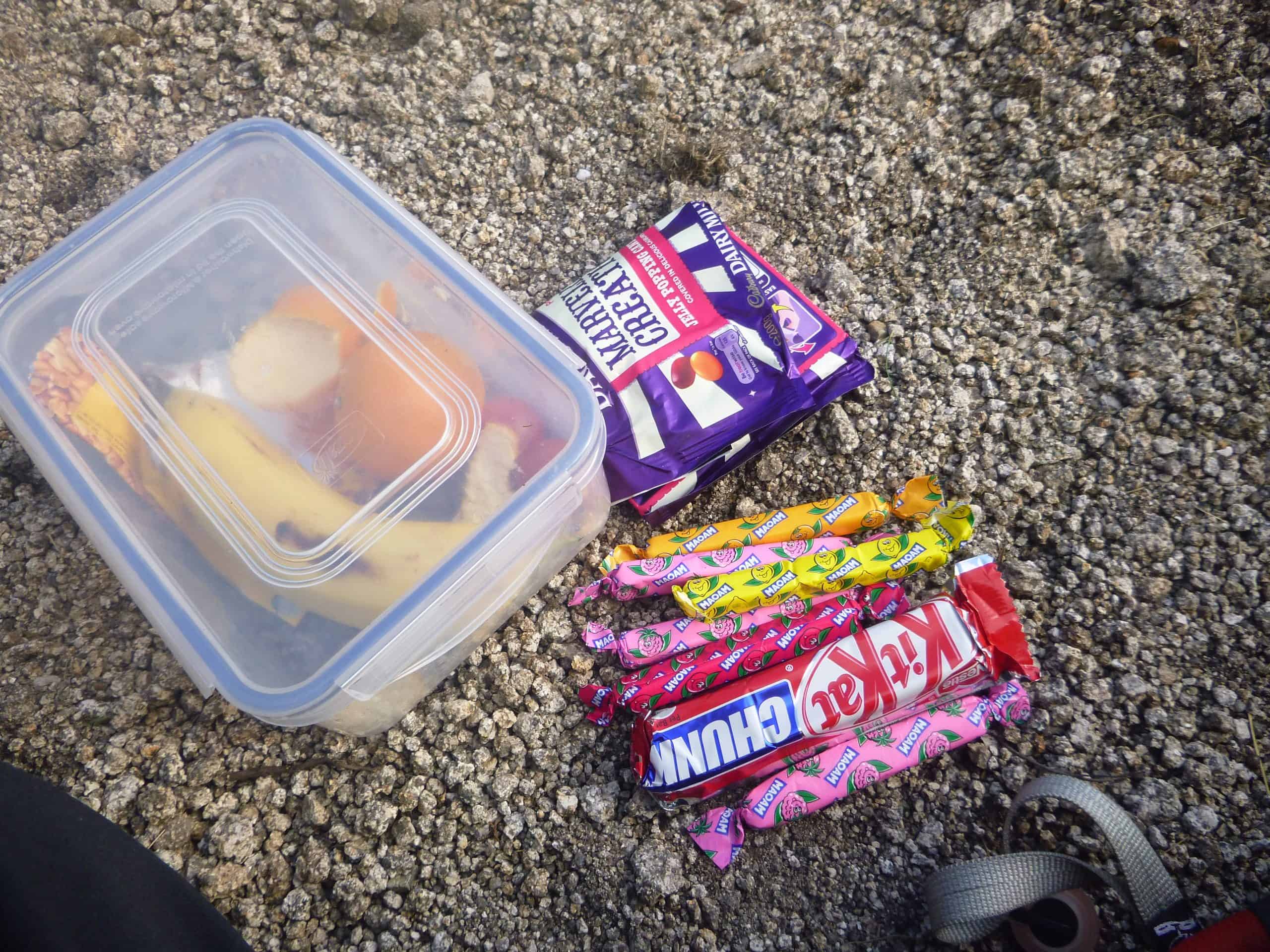 A plastic container with sliced fruit, including bananas and oranges, alongside chocolate bars and fruit-flavored candies, prepared for a hike.