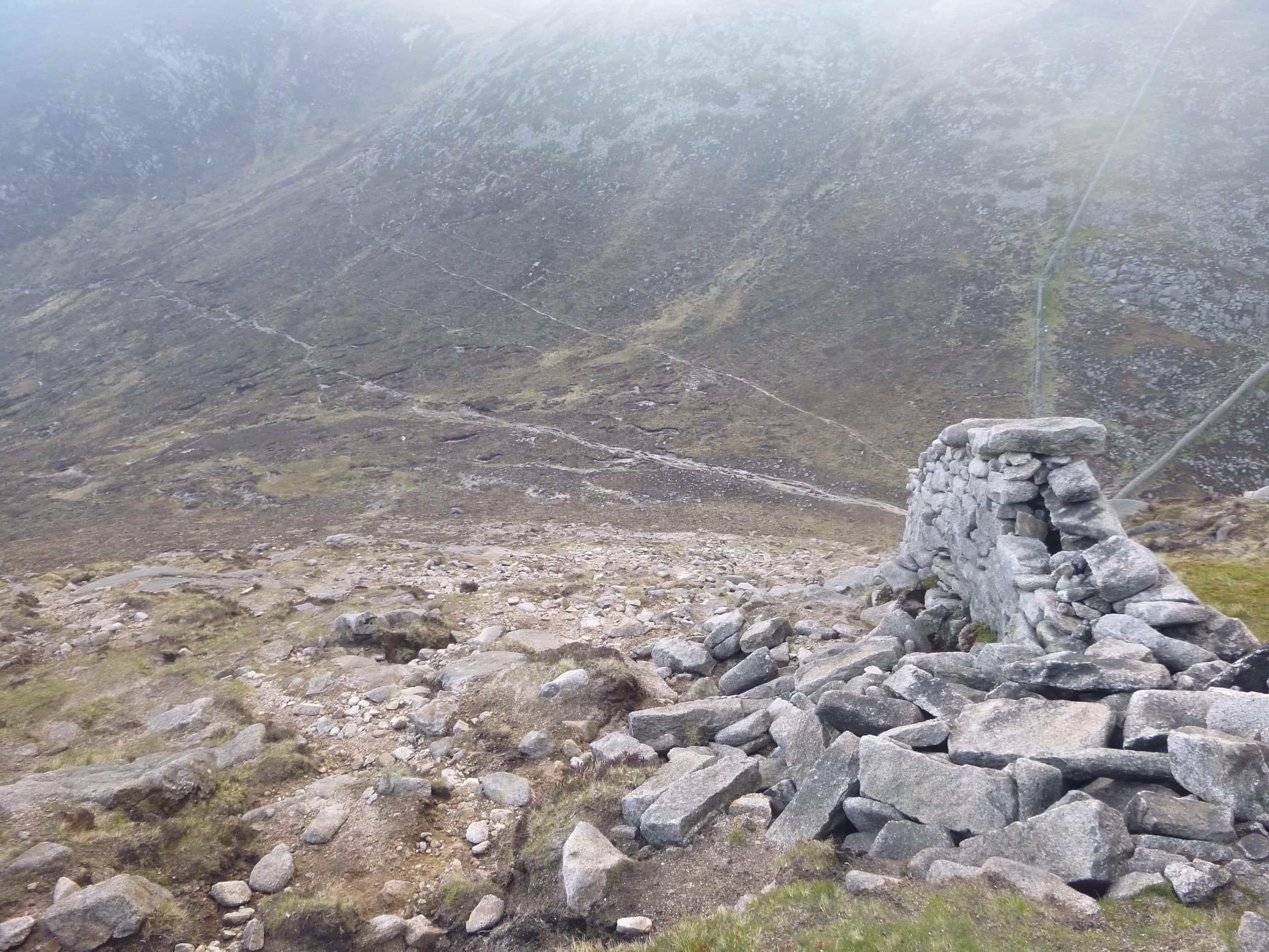 A cairn constructed of stacked stones on a rugged mountain trail, with rocky terrain and misty slopes in the background, ideal for hiking and outdoor exploration.