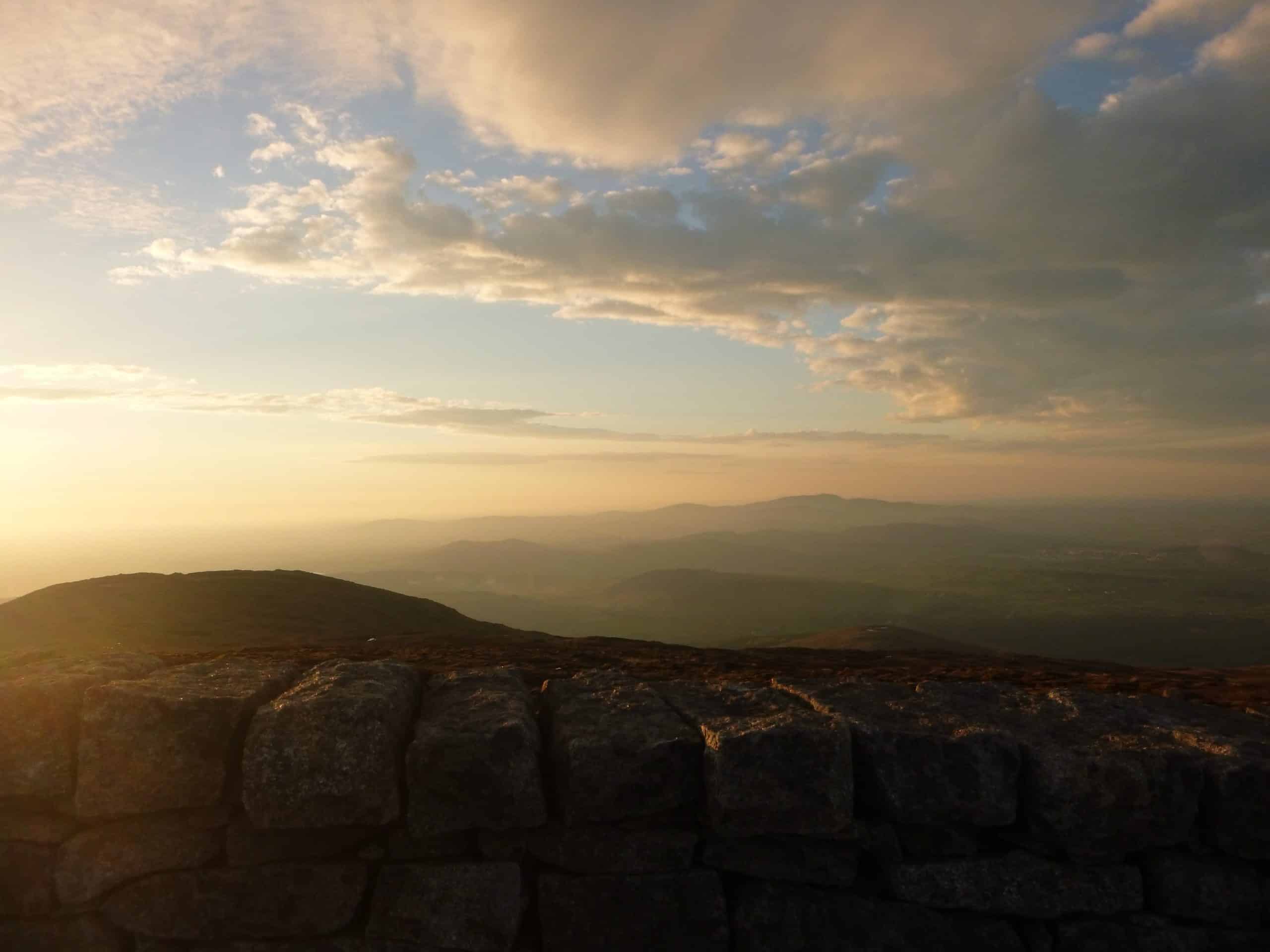 A breathtaking sunset view over rolling hills captured from a mountain summit with a rustic stone wall in the foreground, highlighting outdoor hiking and nature photography opportunities.