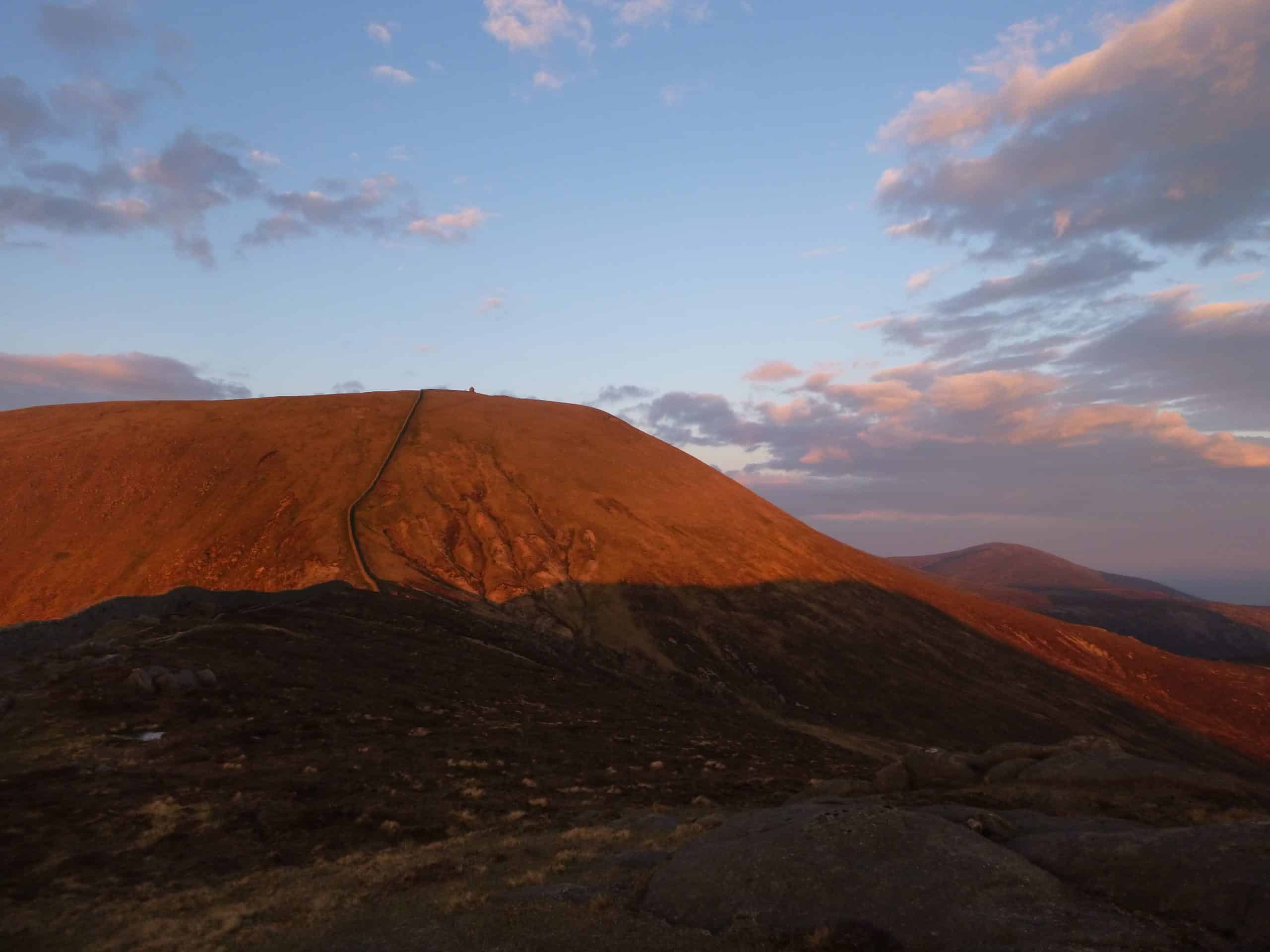 A picturesque view of a large, reddish-brown hill at sunset, with a winding trail leading to the top, ideal for hiking enthusiasts exploring outdoor adventure and scenic routes.