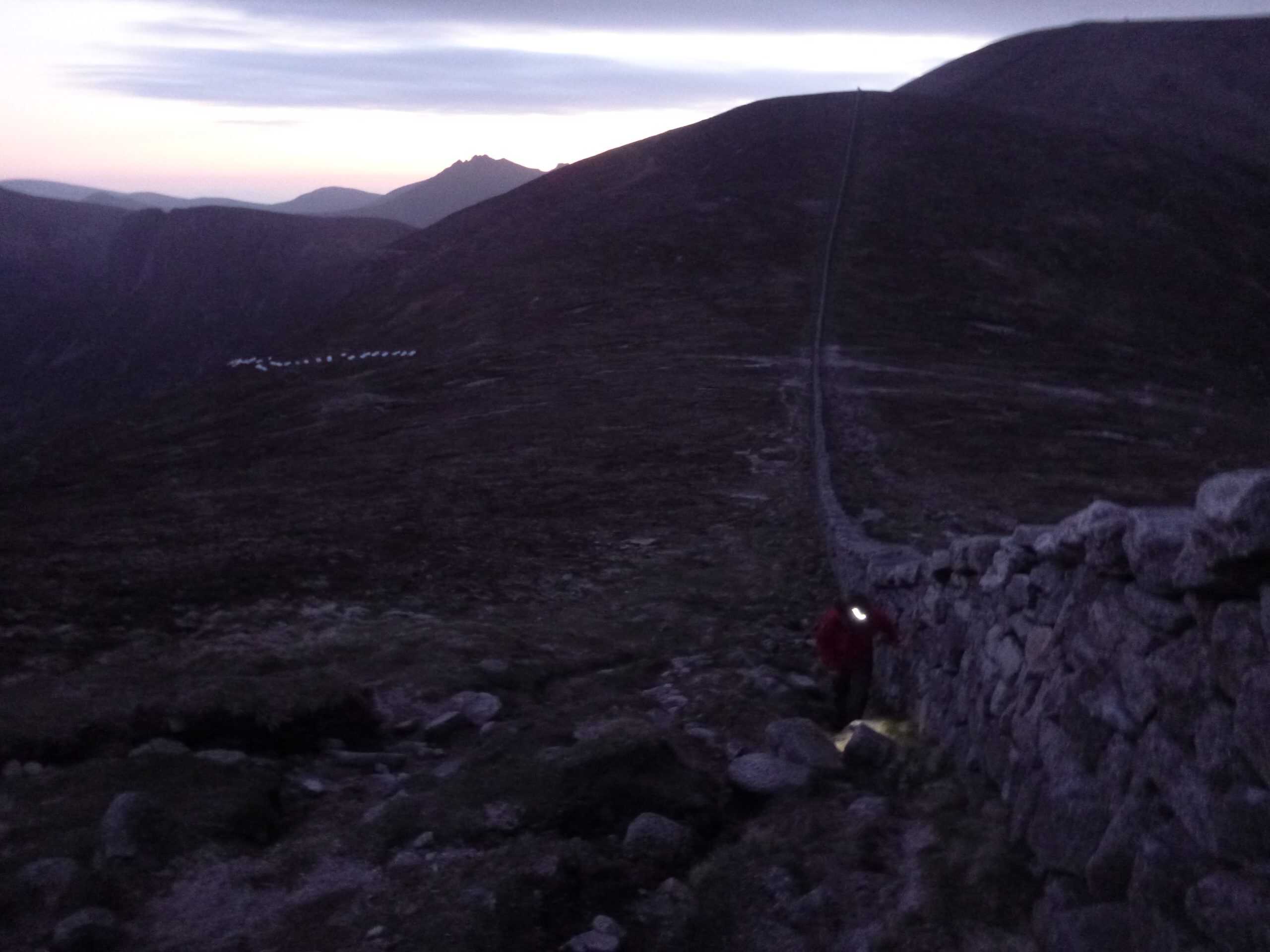 Exploring remote mountain trails at sunset or dusk, highlighting outdoor adventure and hiking experiences in rugged terrains.