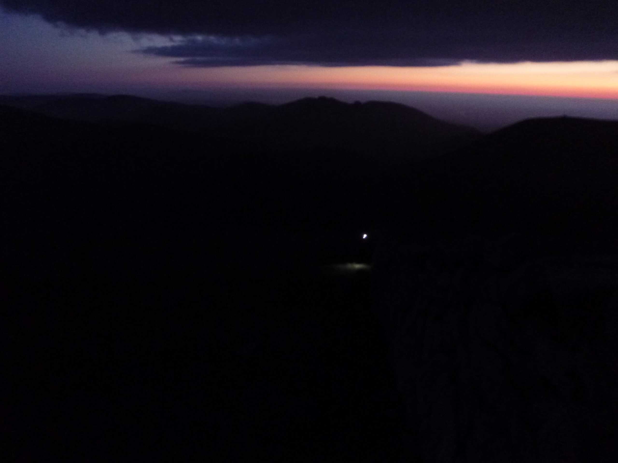 A nighttime mountain scene captures the silhouette of rolling hills under a vibrant sunset sky, featuring hues of pink, purple, and orange, creating an inspiring backdrop for outdoor hiking excursions and adventure photography.