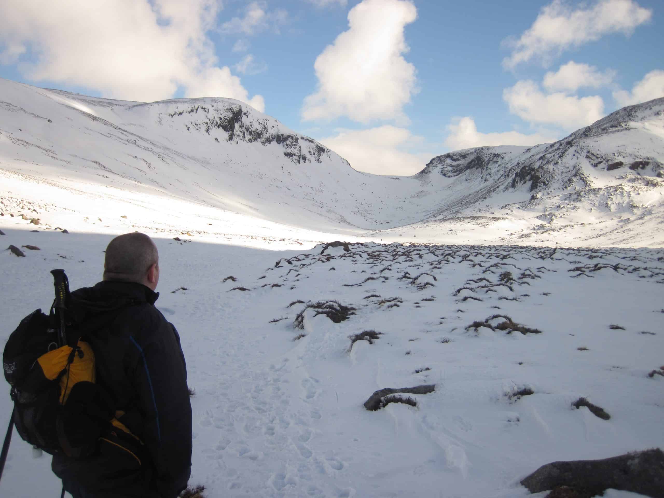 A hiker exploring a winter mountain trail with snow-covered slopes and rugged terrain, surrounded by rugged peaks and a partly cloudy sky, perfect for outdoor adventure lovers and trekking enthusiasts.