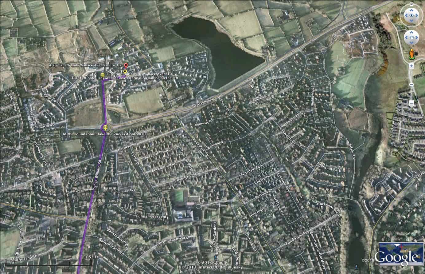 Walking directions and route visualization for outdoor hiking and exploration in Lisburn, Northern Ireland.