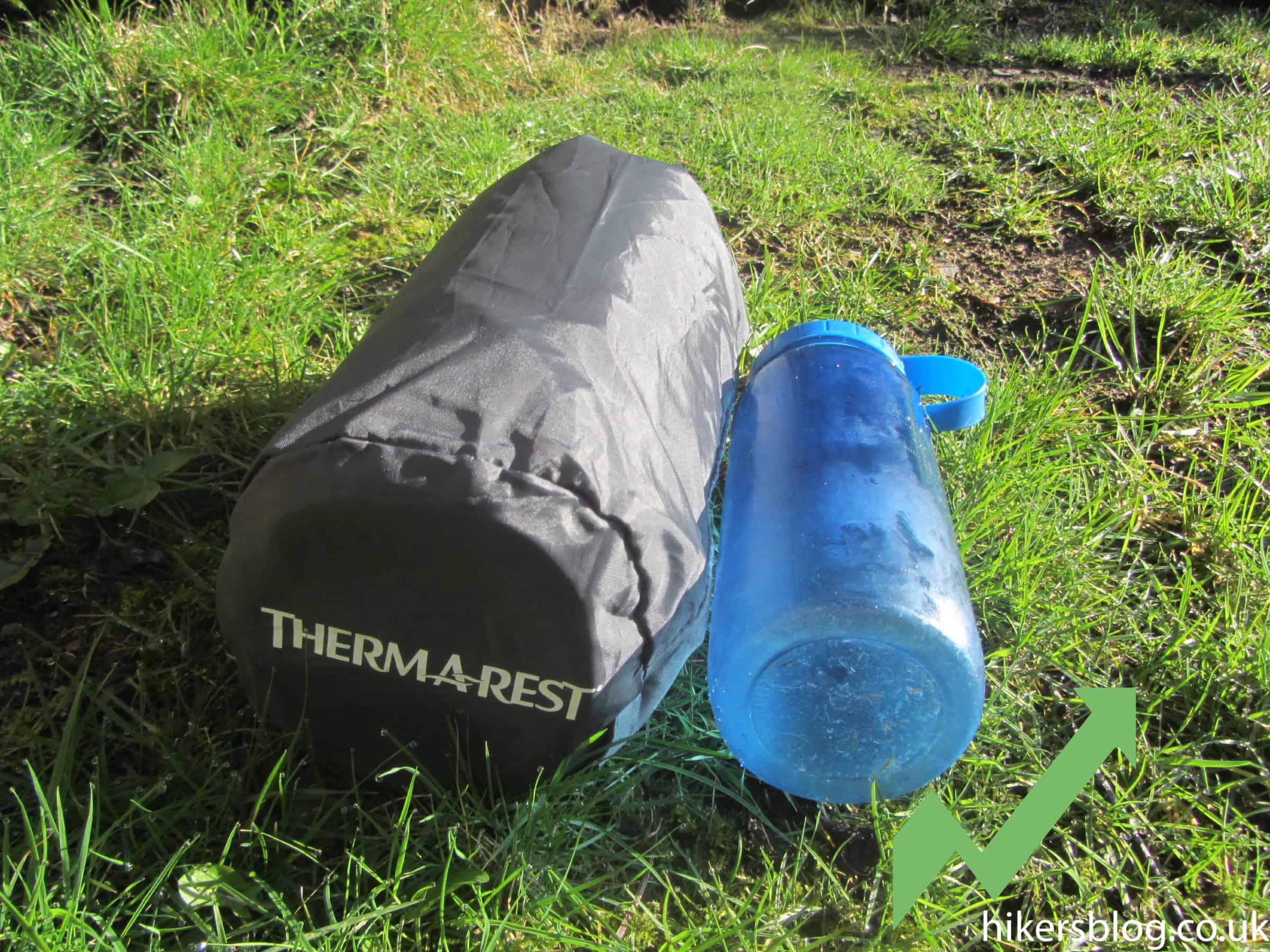 A close-up of a black Thermarest dry bag and a transparent blue water bottle placed on green grass during a hiking excursion, highlighting essential outdoor gear for hydration and gear storage, perfect for trail walking, camping, and outdoor adventures.