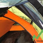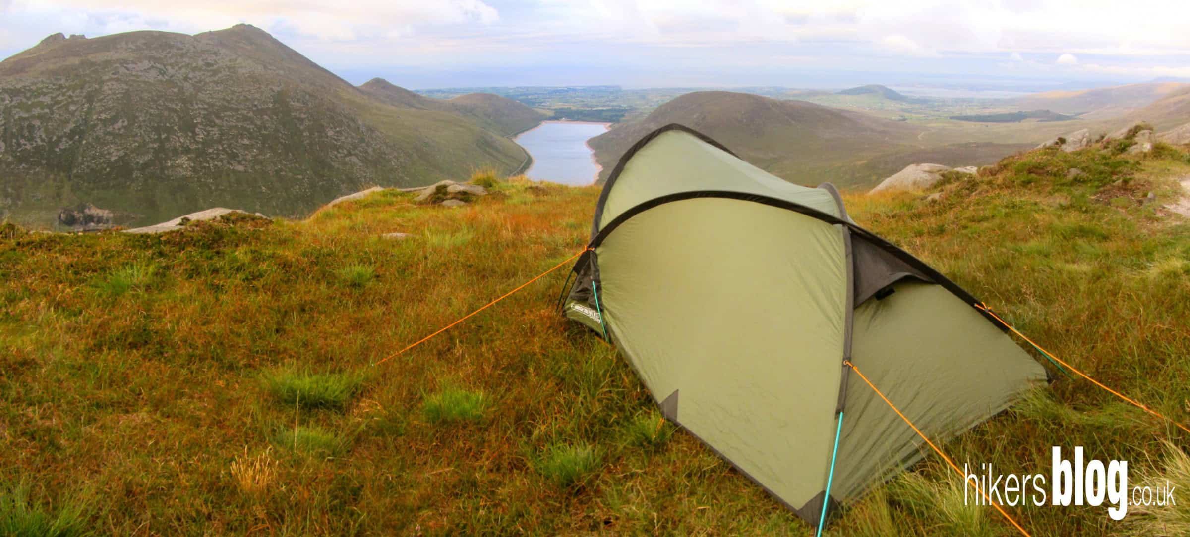 A tent pitched on a grassy hill with a stunning view of mountains and a lake, perfect for hiking adventures and outdoor camping in scenic landscapes, ideal for nature lovers and trekking enthusiasts.