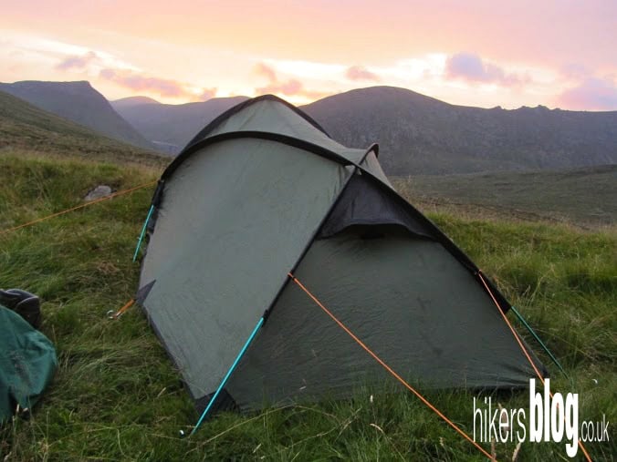 A durable camping tent pitched on grassy terrain amidst rolling hills and mountain peaks at dusk, ideal for hiking, trekking, and outdoor adventures in scenic wilderness areas.