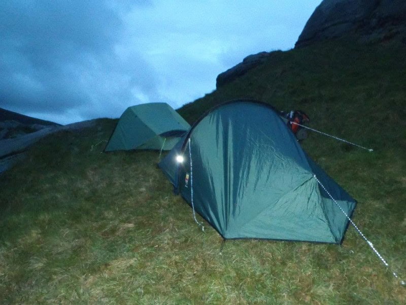 A modern lightweight camping tent set up on grassy terrain during dusk, surrounded by green hills and cloudy skies, ideal for hikers and backpackers exploring scenic landscapes.