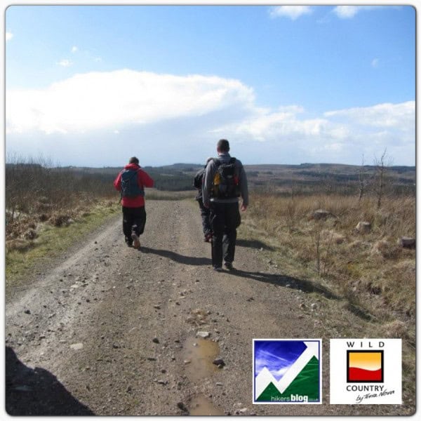 Hikers walking on a rugged dirt trail through the countryside, perfect for outdoor adventure and hiking enthusiasts.
